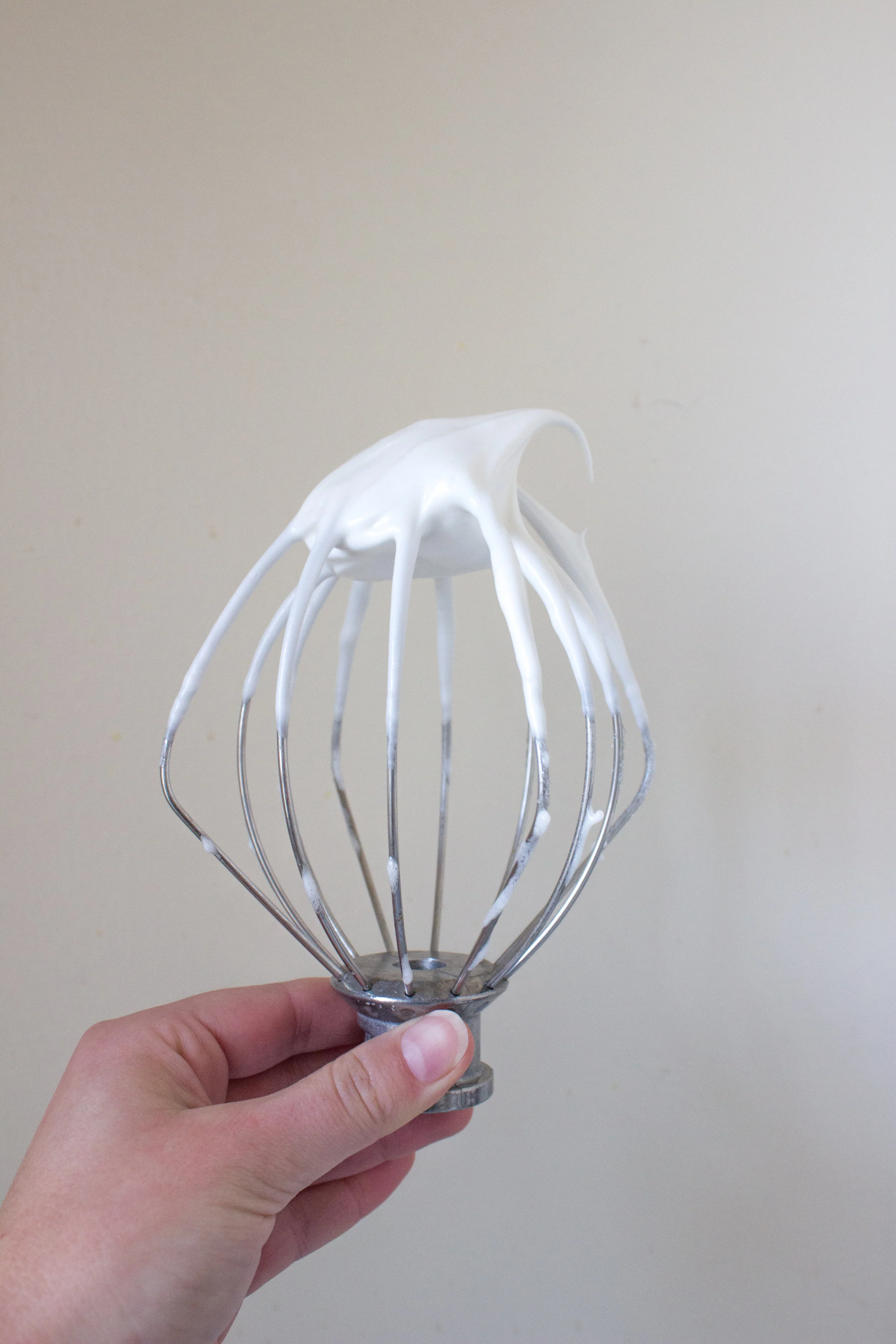 4. Place the bowl in the KitchenAid mixer and using the whisk attachment, whisk the mixture on medium speed until it becomes foamy. Increase speed to high and continue whisking until stiff, glossy peaks form.