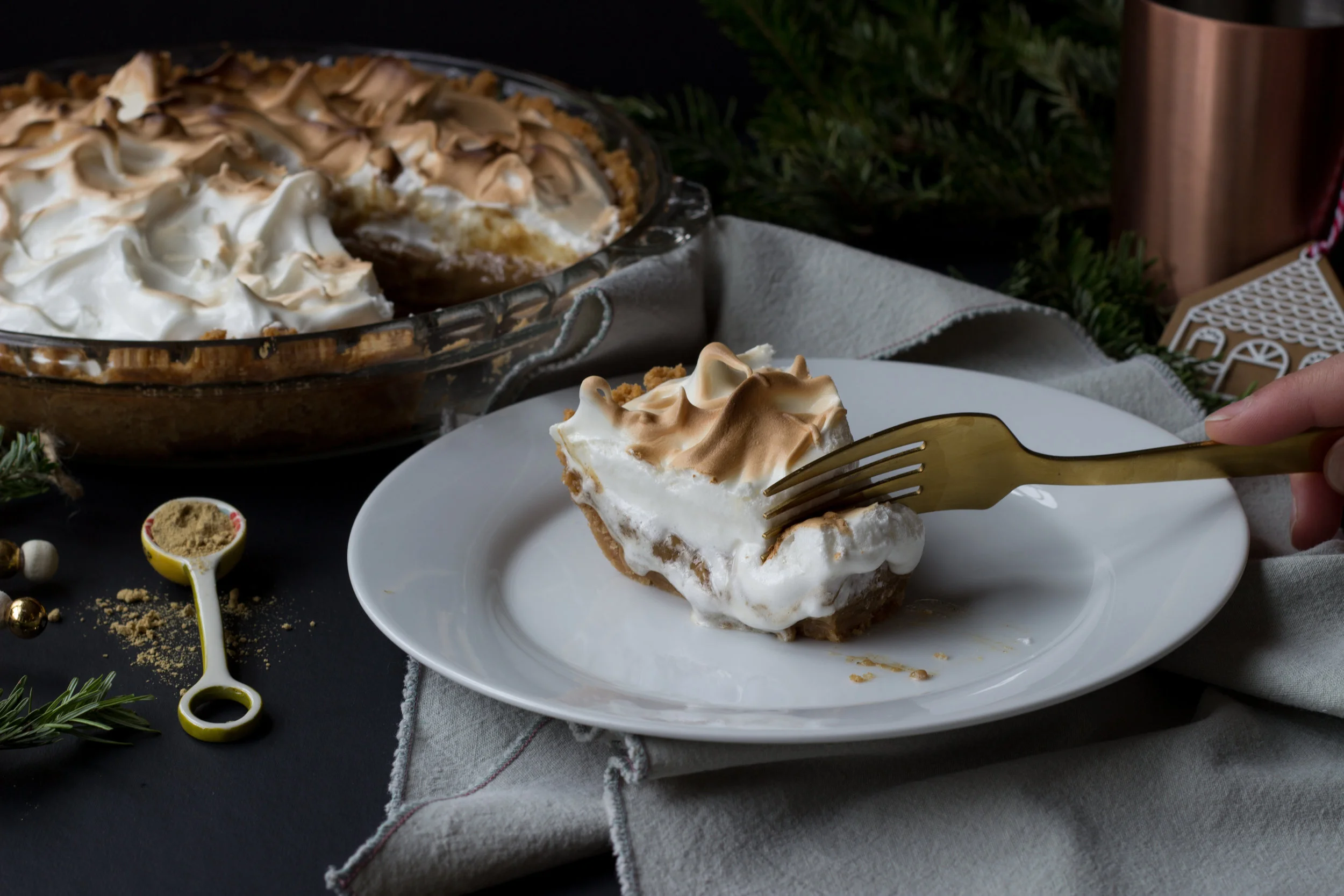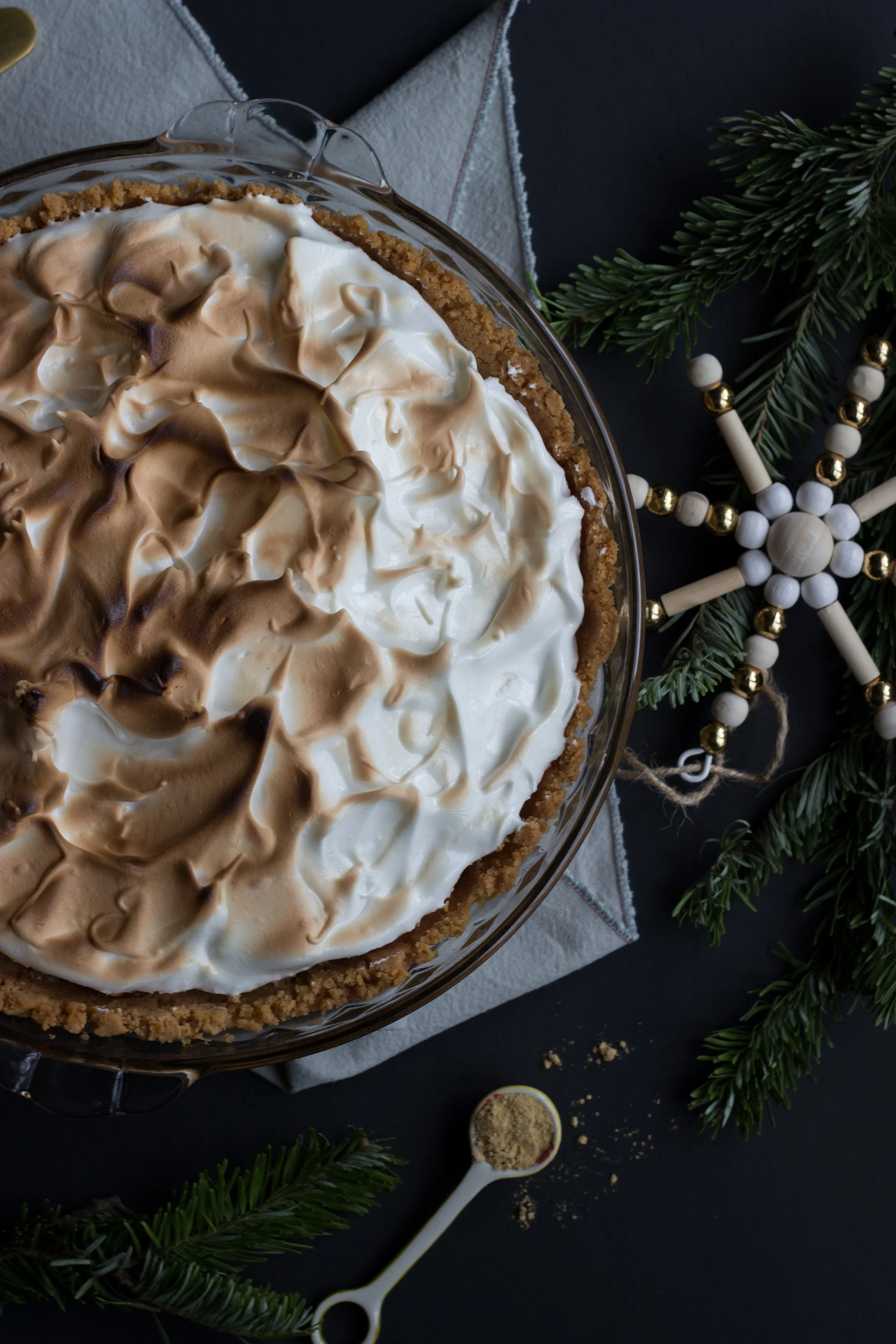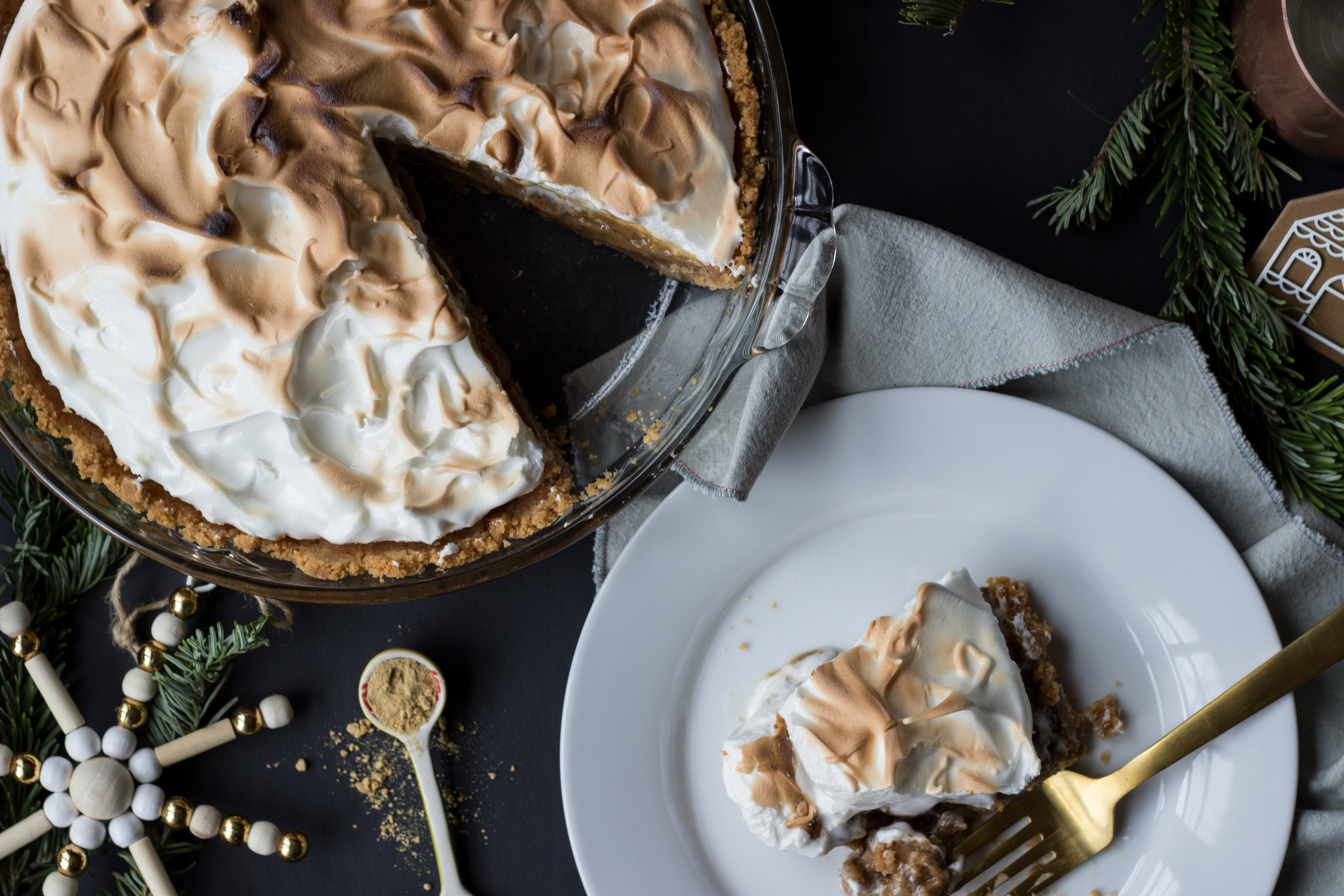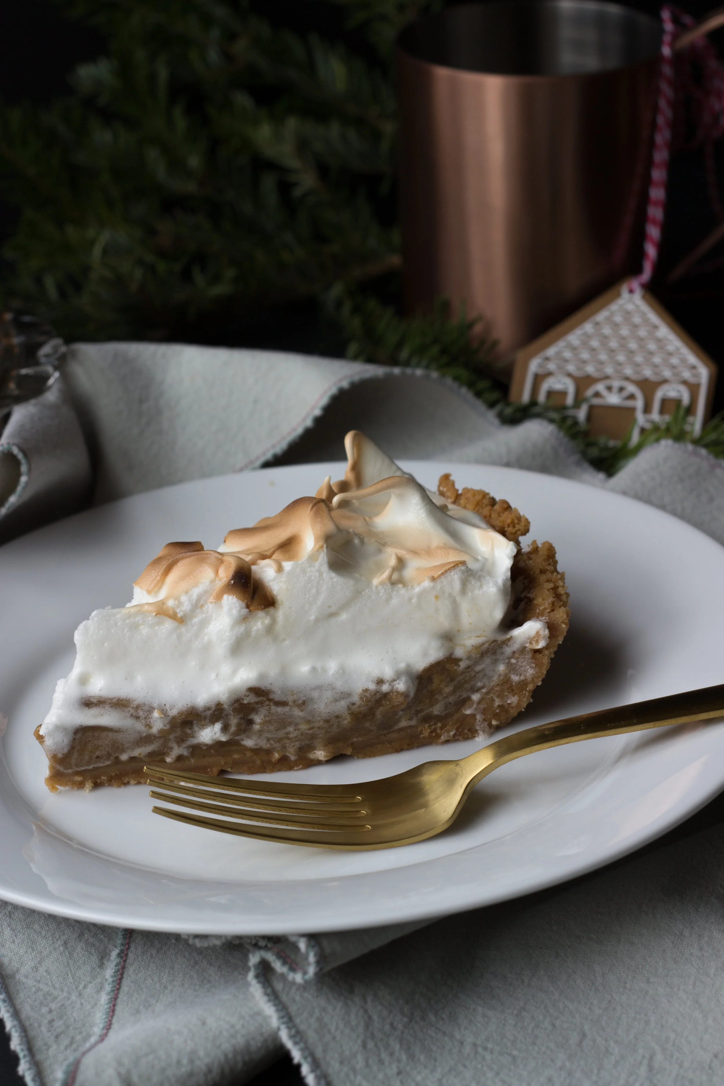 /My affinity towards ginger has continued to evolve over the years, but in a rollercoaster fashion. I grew up loving my mom’s ginger molasses cookies that she would make during her holiday baking every year, making sure to stash a couple extra before she gave them away to friends and family. But a couple years ago I tried a tiny portion of store bought candy crystallized ginger from a friend, and it took me half an hour to eat that thing simply because I was trying to get as little as possible in my mouth at a time. Thankfully she noticed my struggle, and graciously let me throw the rest out. From then on, I thought I hated ginger! But I hated that I hated it because, I mean, gingerbread men are so stinkin’ cute and I always envisioned that I would be eating them as I watched the snow fall outside once we moved to Minnesota. So, I figured I should give ginger one more try before I ruled it out forever. And boy am I glad that I did, because this gingerbread meringue pie has the coziness of gingerbread and snowfall without the overpowering crystalized ginger taste.